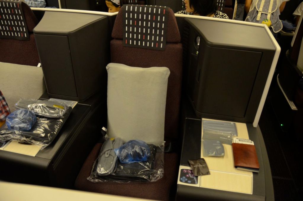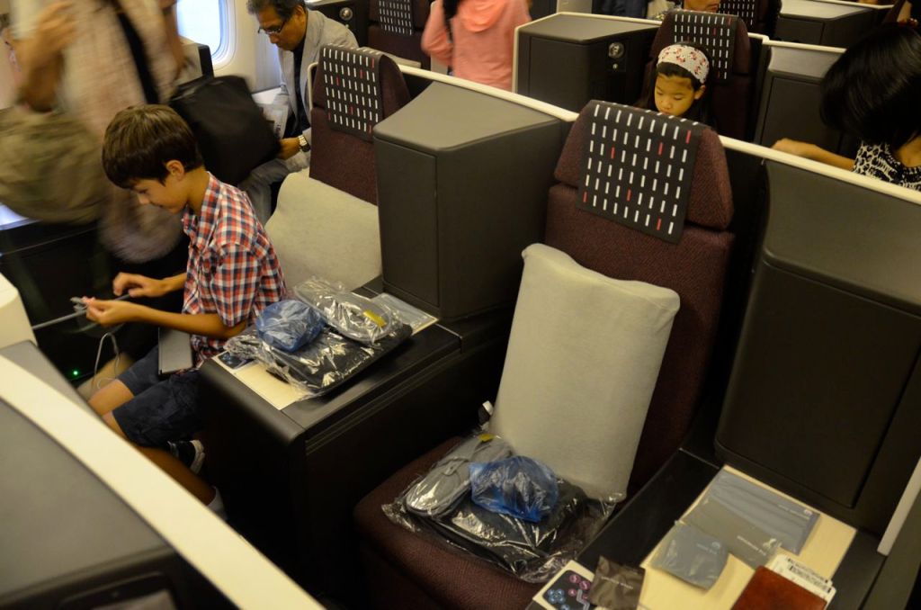 Once on board , we settled into a a seating configuration in a staggered 1-2-1 configuration. While I usually appreciate a window seat, I elected for the pair of centre seats in order to be able to monitor and travel with WT73 Jr. Unlike Asiana Airlines Business Class A380 Los Angeles – Seoul Incheon which offers a staggered seats in business class, there was no difference in between the centre seats on the Japan Airlines Sky Suite II. As Japan Airlines didn’t have “cuddle” seats or “apart” seats, there’s no real difference in row selection, aside from the choosing the bulkhead nearest to the galley, or the last row nearest to the bassinet positions. My last comment on the centre seats is that there is also no privacy screen between the centre seats if that is important to you. The cabin is bright and airy with lots of natural light.