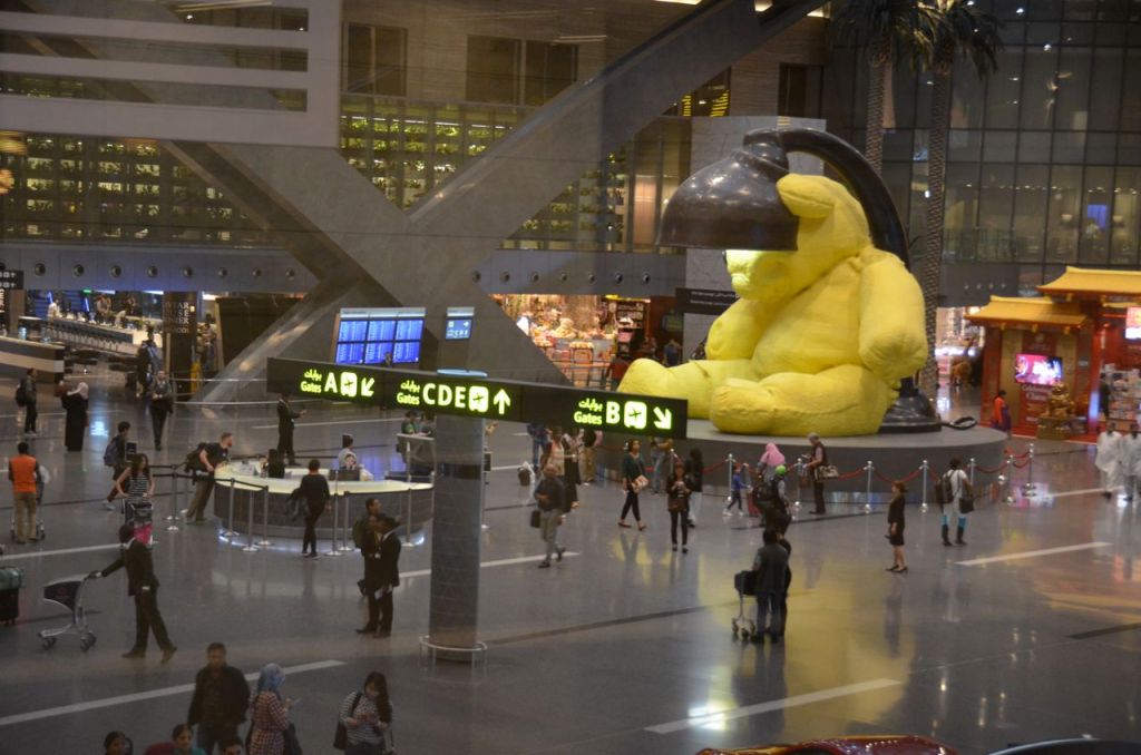 We got off the plane and entered the fantastic Doha Hamad International Airport. Between the three Middle East Airports, I think this one is heads and tails above Dubai and Abu Dhabi. We happened to see the million dollar stuffed bear on our way through to customs.