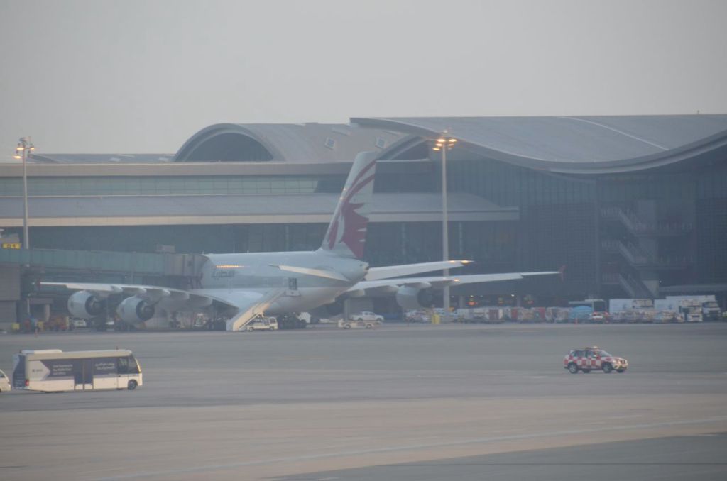 We had a nice approach into Doha at sunset, arriving to Doha Hamad International Airport next to an Emirates Boeing 777. I managed to spot the Qatar A380 which I hadn’t seen before.