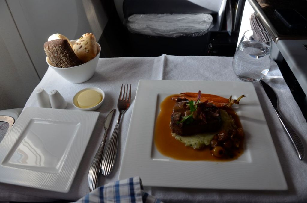 The meal service was offered immediately after take off, or almost 40 minutes into the flight. The dining was a la carte – literally I asked for the beef and got the beef served right away. I should have ordered the appetizers as well, in that order. Instead, I had the entire meal in reverse sequence.