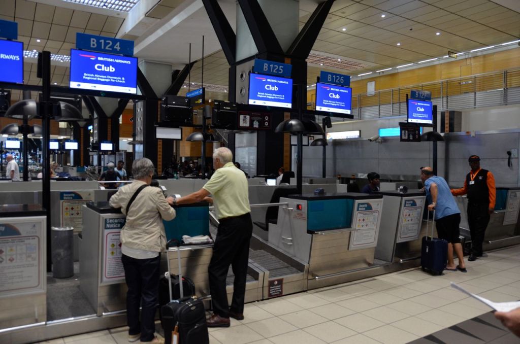 After arriving on Qatar Airways Business Class Doha – Johannesburg, and dealing with our misplaced / lost baggage issues, we headed land side and were directed upstairs to bag drop. Although there was a manned British Airways connection desk in the usual international arrivals hall, it was not working and we were directed to proceed upstairs.