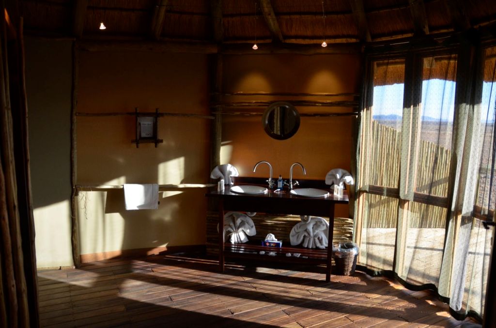 All the rooms at the Sossus Dune Lodge are private stand alone villas, with thatched roof buildings. They each have their own private bedroom, sunrise or sunset facing deck, integrated bathroom with flowing water and a dressing area and closet area.
