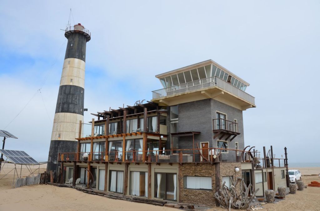 As I was looking for places to stay in Walvis Bay Namibia, I found the usual Protea (now under the Marriott group) branded hotels. Some of the properties looked to be inviting but didn’t look to be too out of the ordinary. During the research part, I happened to find the Pelican Point Lodge. The Pelican Point Lodge is situated next to an old lighthouse on the sand bar outside of Walvis Bay, Namibia. You actually get to sleep adjacent to the lighthouse in the middle of nowhere. OMG Wow – it looked like a unique experience and one look at these photographs and I was sold. The top photo is courtesy of their website. You need a 4 x 4 truck to get there as the property does not have any paved access roads as it is situated in the middle of a sandbar with the Atlantic Ocean on one side, and the Walvis Bay Ocean on the other.