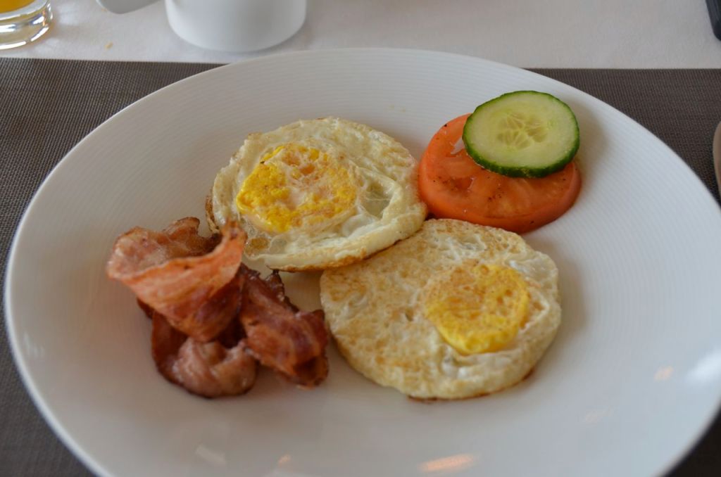 We took in some breakfast upstairs, where there were cold offerings, in addition to hot cooked to order dishes. I went with the simple eggs and bacon offering, with some Nespresso.