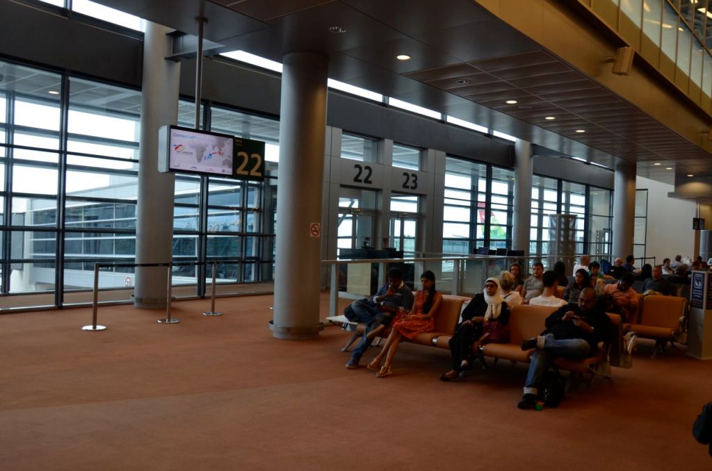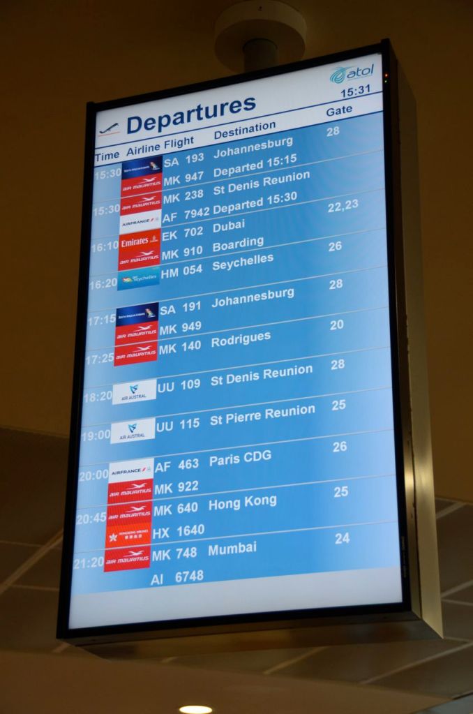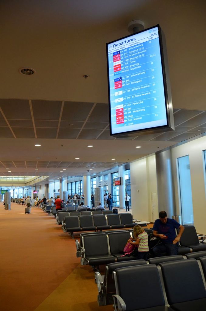 We departed the lounge and walked to the other end of the terminal for boarding at gates 22 and 23. We passed by the Mauritius flight boards which have planes departing to a variety of exotic destinations.
