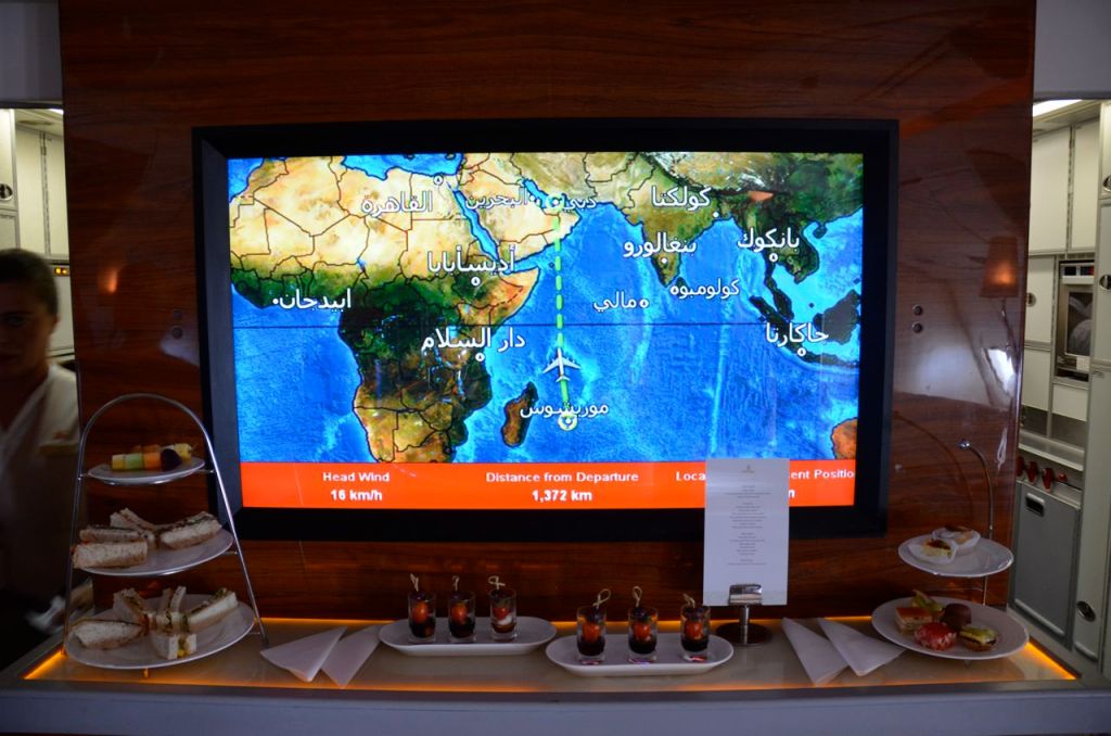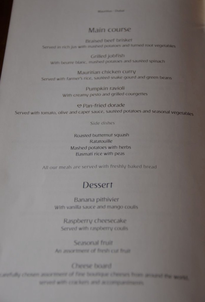We had some captain announcements and a posted flight time of five hours and forty five minutes travel time from Mauritius to Dubai. We had a whole suite of pre-departure services which occurred after we had arrived on board.