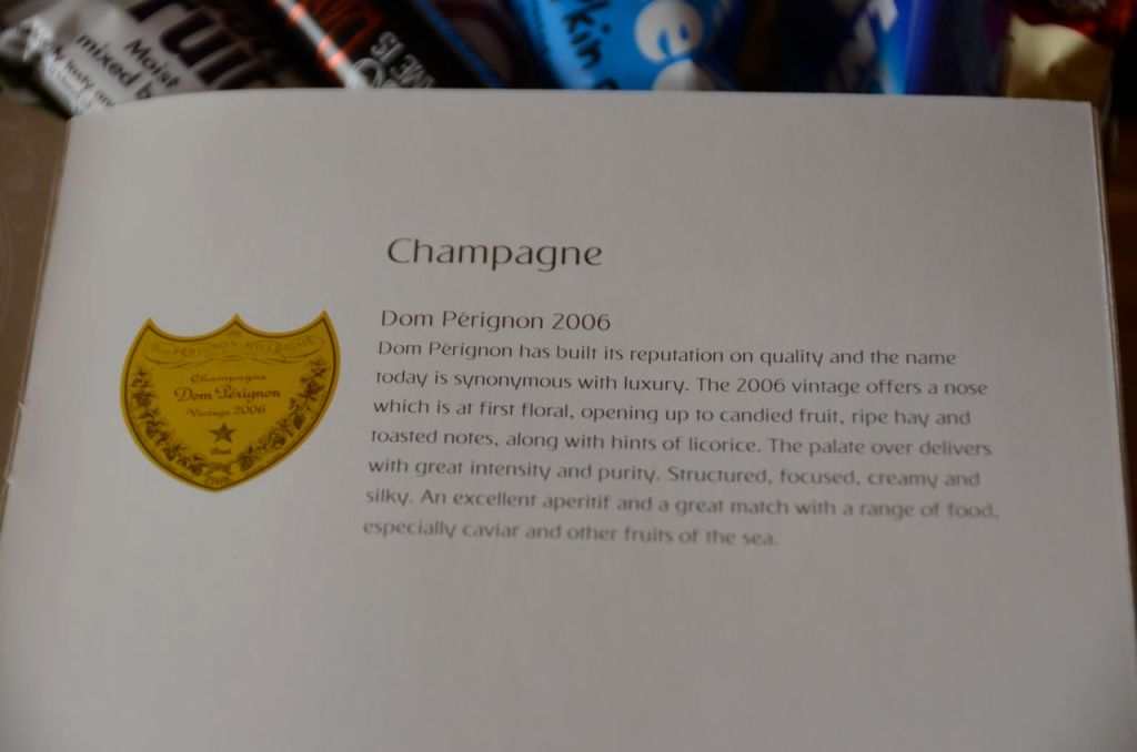 There were 3 crew assigned to first to take care of us. As we levelled at cruising altitude, Dom Perignon 2006 champagne was brought around. We had two glasses with strong efforts by the staff to make sure that they did not go empty. The crew also delivered the individual snack basket, which was placed on the console by the television.
