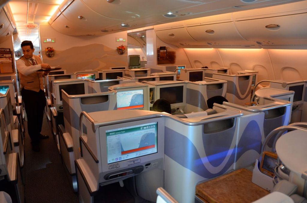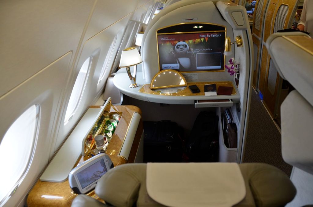 “Emirates First Class is one of the most featured First Class products in the world today. It includes a stand up bar, shower suites and a five course meal with world class wines”