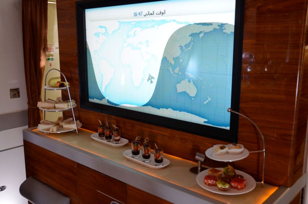 In addition to the bar, the area offers snacks and canapés. It’s a great social way to kill time in a flight. There is also a large flat screen monitor that allows you to track your flight path.