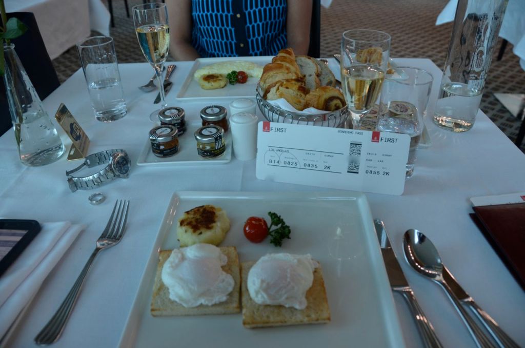 I had soft poached eggs, a rarity on our Middle Eastern and African travels, paired with a cold glass of Moet and Chandon champagne. A fabulous bread basket was also offered. The ability to dine in the lounge with a proper breakfast has always been a terrific way to start a flight.