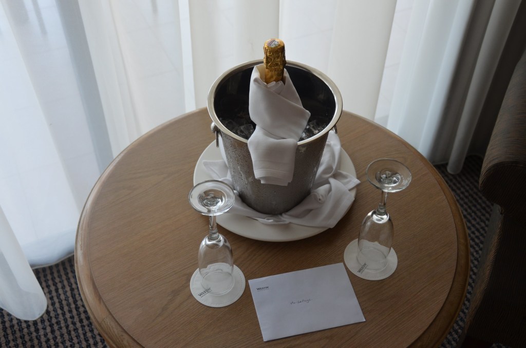 I had written the hotel in advance and indicated we were staying on the celebration of our wedding anniversary and the hotel was kind enough to offer a complimentary bottle of Italian Prosecco chilled on ice waiting for us in the room.
