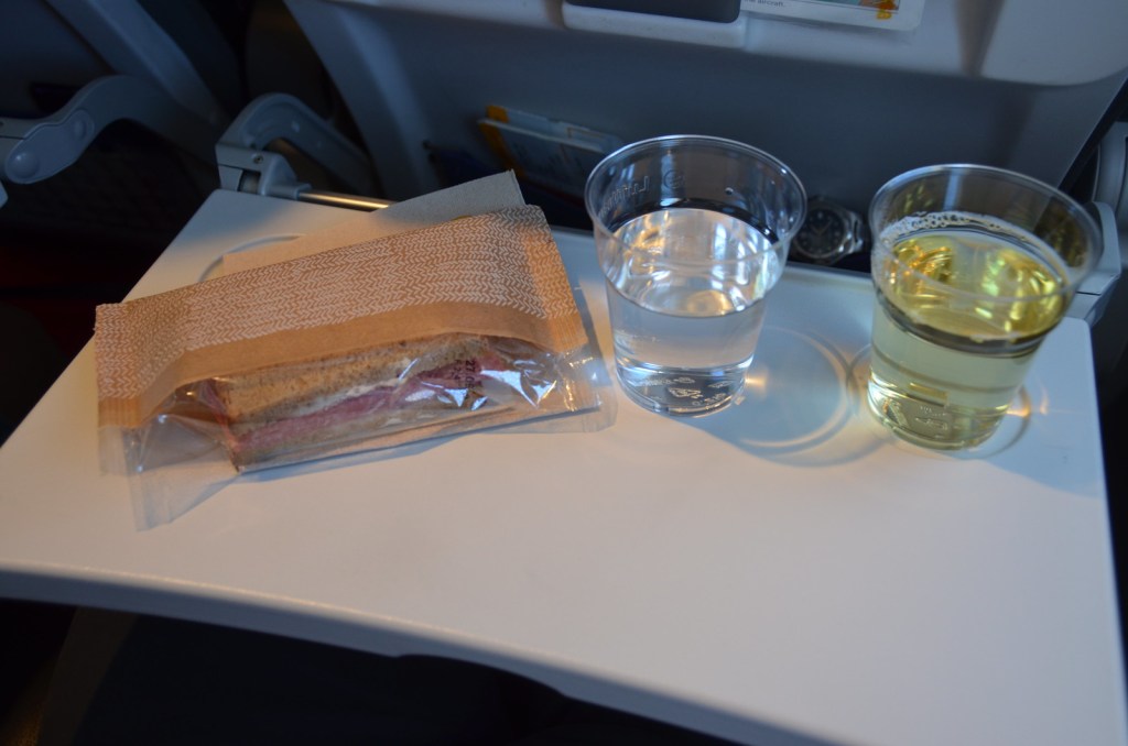We had a prompt offer of cheese or salami sandwich, along with white wine and still water. We managed to get a wine refill once before the service concluded, which was surprisingly unexpected for economy class.