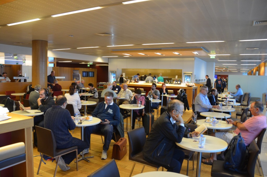 The Air France Lounge Terminal 2E concourse L is a large rectangular space with food and beverage areas spread throughout the lounge. The lounge was very busy and we didn’t find any space to sit other than at the tables. Relaxing and tranquil were not adjectives that I’d use to describe the environment. It was packed, short on available space for seating, lots of bags in the walkways, and strangely full of grumpy looking people.
