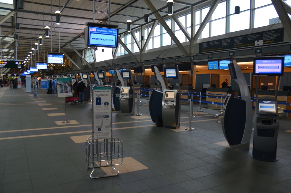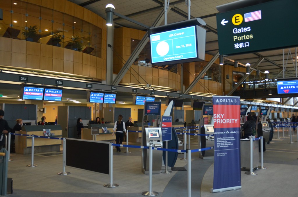 On arrival to the Vancouver International Airport, the Delta Airlines Sky Priority Check in was completely deserted today and we used the kiosks to get the boarding cards prior to having our bags tagged. We have been doing carry on only most of the time, but since this trip was designed as a shopping trip, we elected to check a mostly empty additional suitcase for items returning to Vancouver at the end of our shopping extravaganza.
