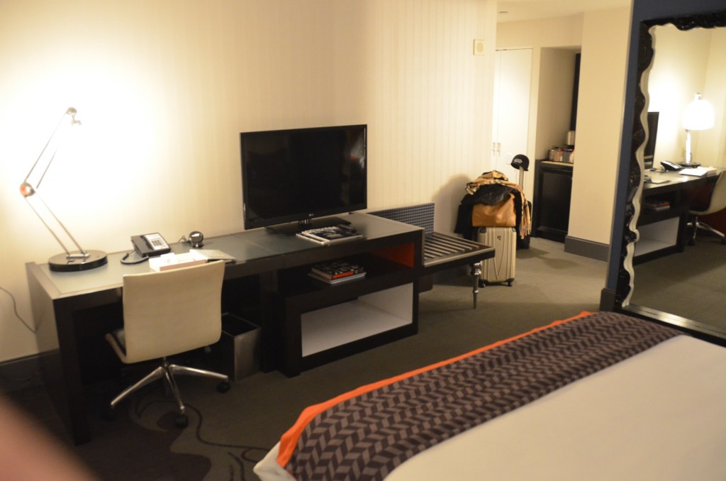The room contained a flat screen television. It was supported on a console that doubled as a desk and a suitcase holder. Being a W Hotel, the room was nicely equipped, with proper charging plug ins and many places for dropping multi media devices.