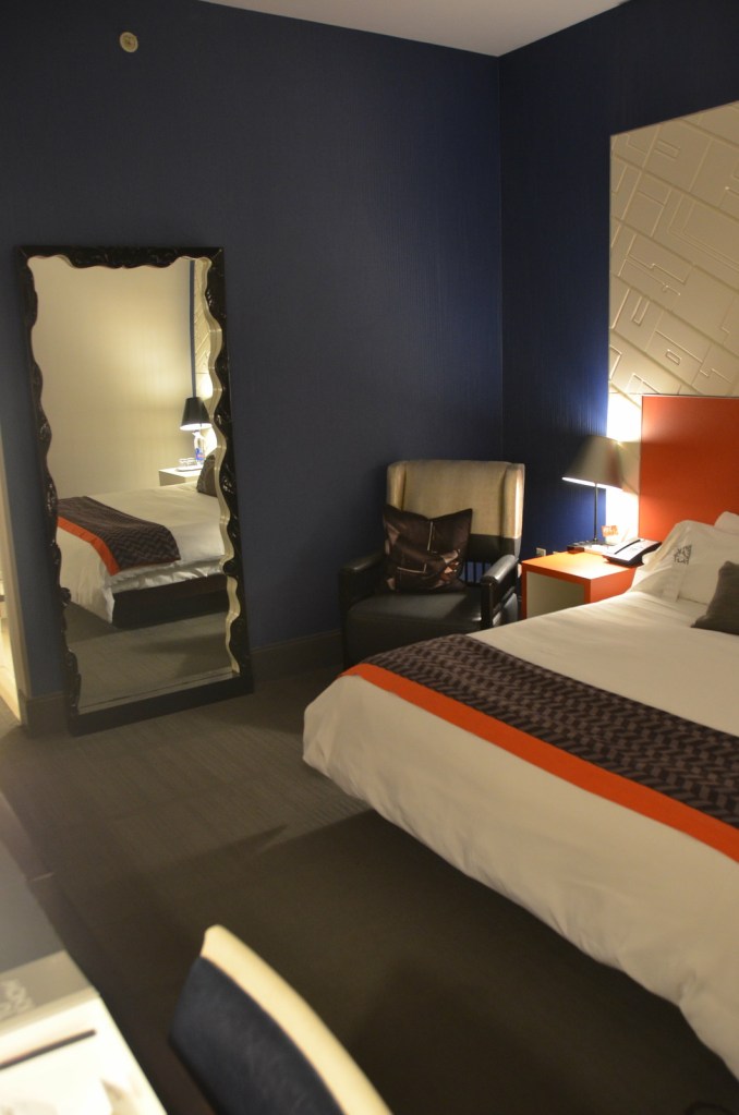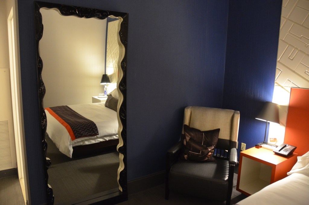 After checking ourselves in, we led ourselves up to our room on the fourteenth floor. While there was a contemporary look to the hotel hallways, it was quite a dark looking hotel hallway. The dark doors and carpet coverings also added to a somewhat sombre look to the property. The Sherlock Holmes-esque mirrors added a strange vibe to the property, and the mirrors made the halls larger than expected.
