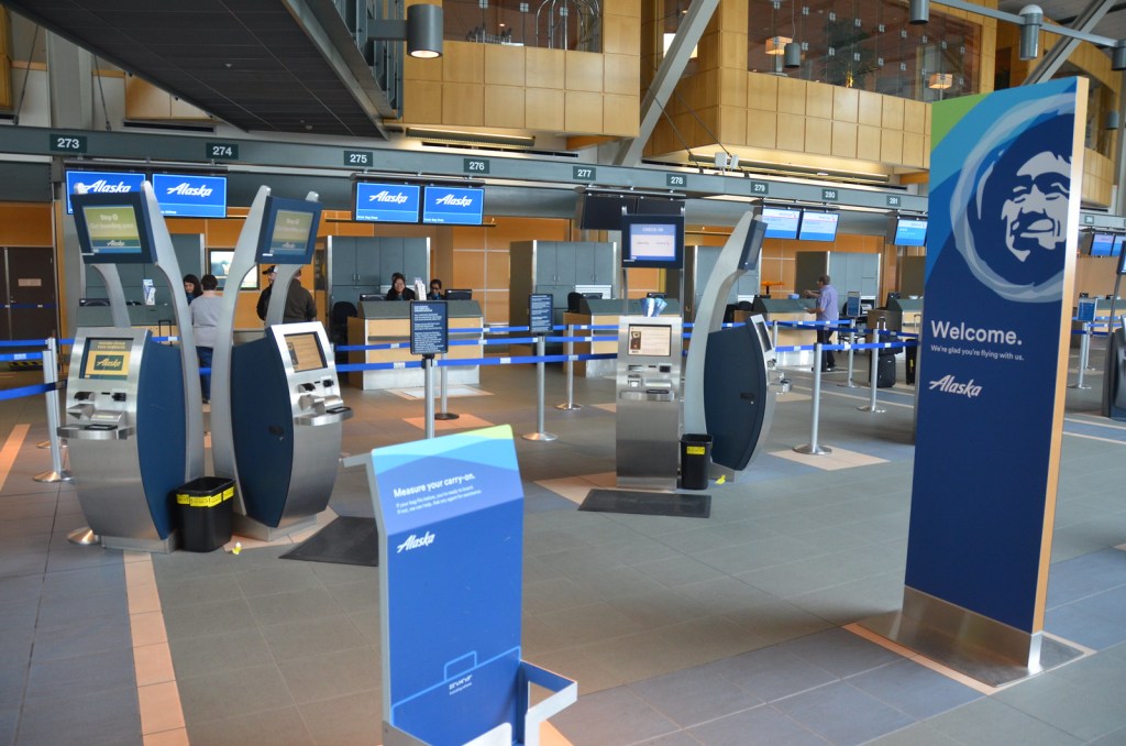 We took an Aerocar to the airport; a Ford Expedition today. We arrived to a quiet departure zone with Alaska Airlines occupying the space immediately under the Fairmont hotel Vancouver International Airport.