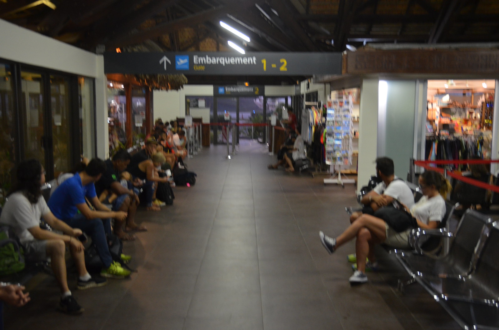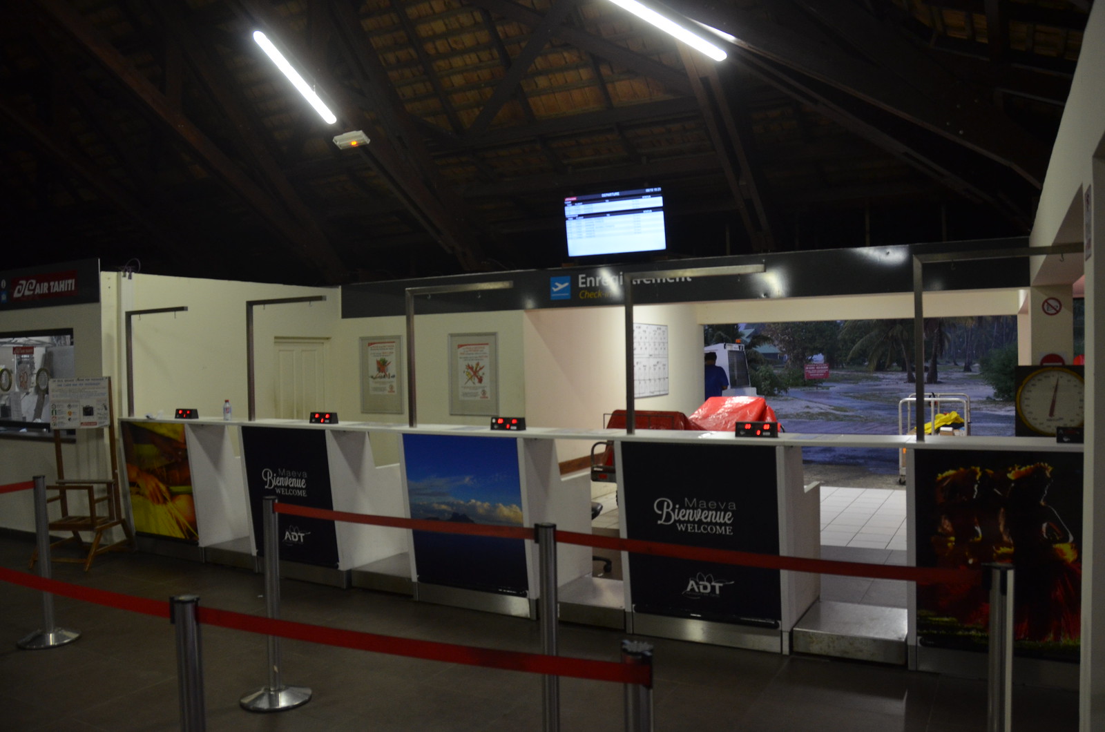 There was only one Air Tahiti check in agent working the airport today and he seemed to be in a rush. He didn’t charge us for our excess baggage like on our Air Tahiti Moorea – Bora Bora flight on the way out; although the ramp agent was calling out the weights of each bag to be transcribed onto a sheet. I don’t know whether the check in agent couldn’t be bothered, or whether the other fees went straight into the check in agent’s pocket at our Moorea stop; possibly a little of both.
