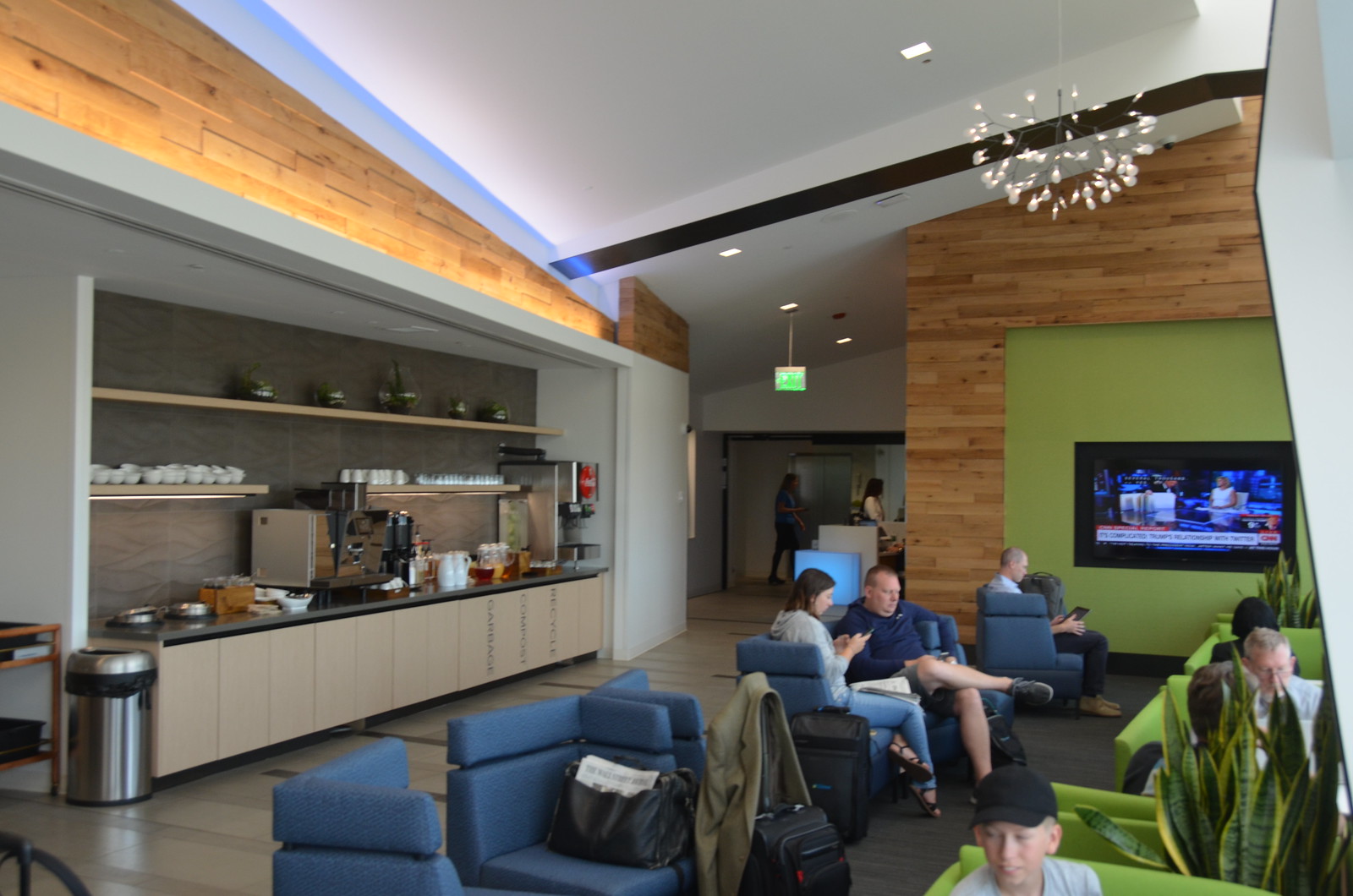 This version of the Alaska Lounge is a brand new space. Once we settled inside, we found ourselves in a really nicely decorated “L” shaped lounge. Most of the seating space was against the windows, in a nice bright environment. While the environment was nice and bright, the lounge seating itself was quite limited as a result of a smaller lounge space at this particular lounge.