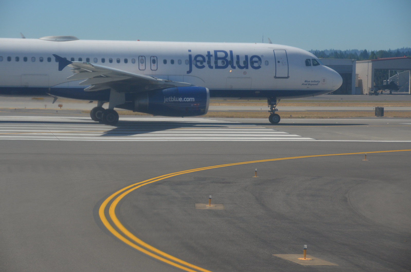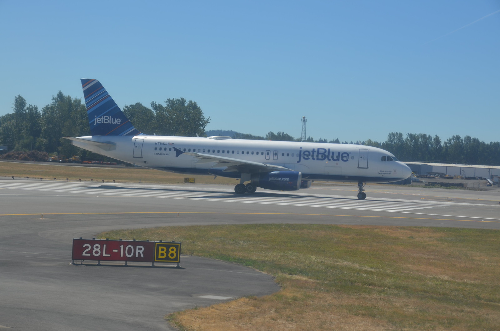 We left Portland International Airport with a westward departure along the Columbia river behind Jet Blue.