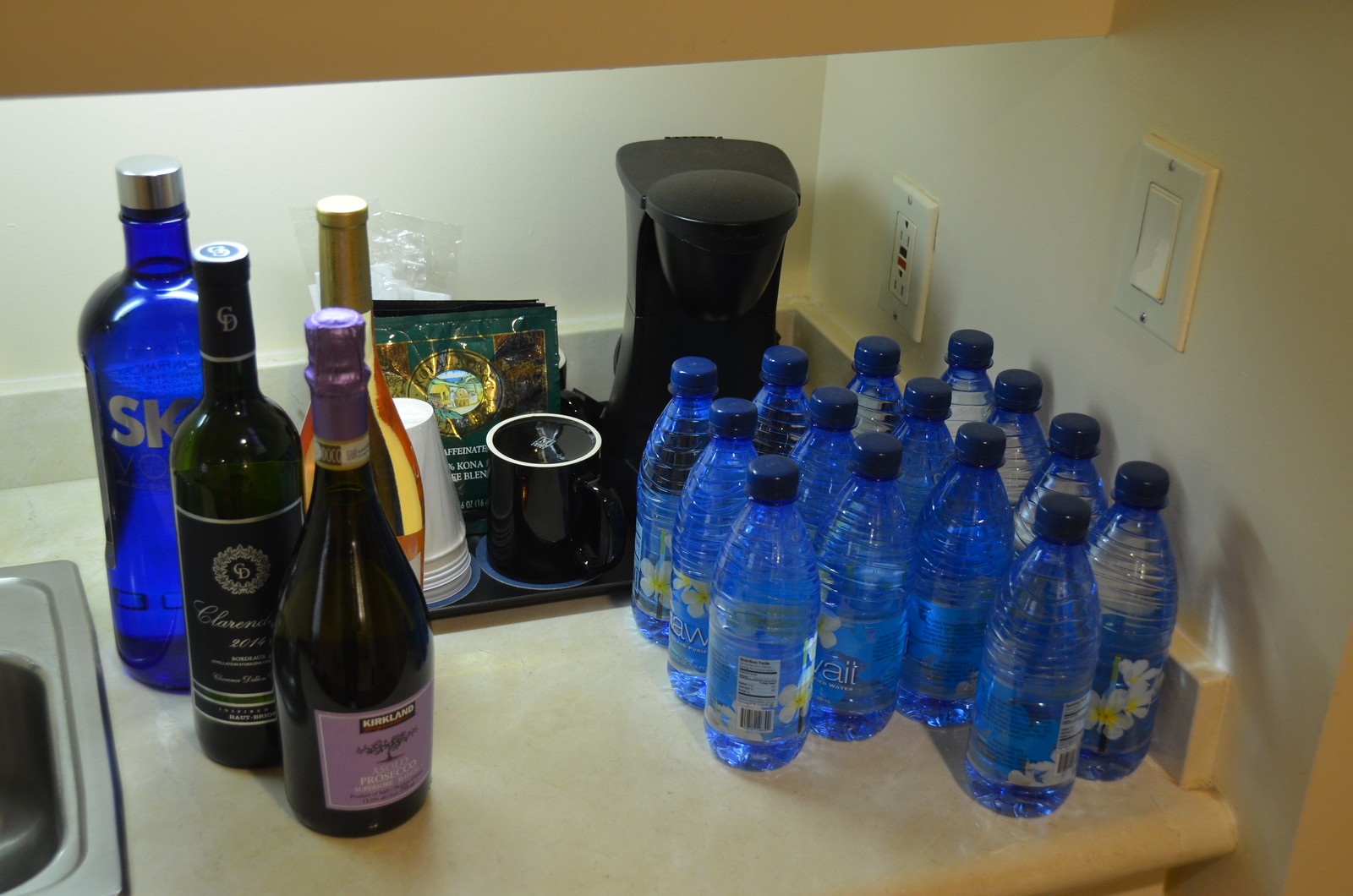 The room also featured a wet bar along with a refrigerator. We promptly stuffed it full of beverages that we had purchased from Costco. The hotel was also kind enough to provide lots of free bottled water for the stay. The pictured 1.75 L bottle of Sky Vodka was not included with the room, or the resort fee.