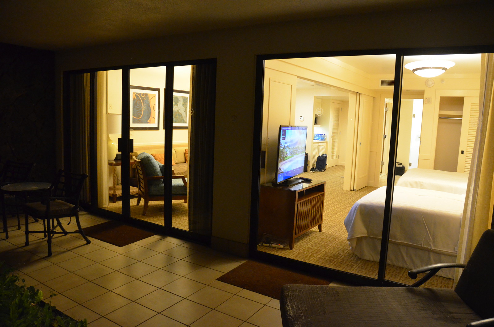 Our Ohana Suite had a nice walk out lanai leading to nicely landscaped grounds… along with a night time view from the outside of the spacious room.