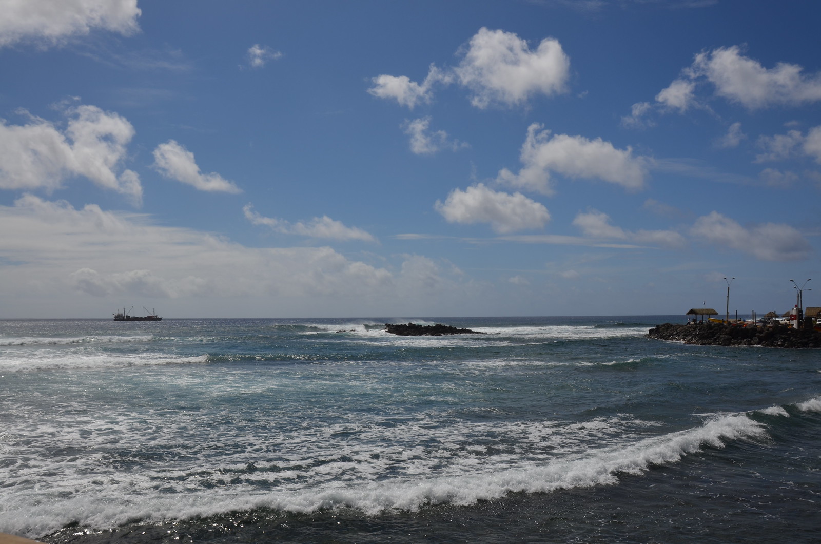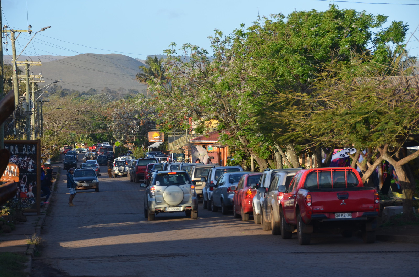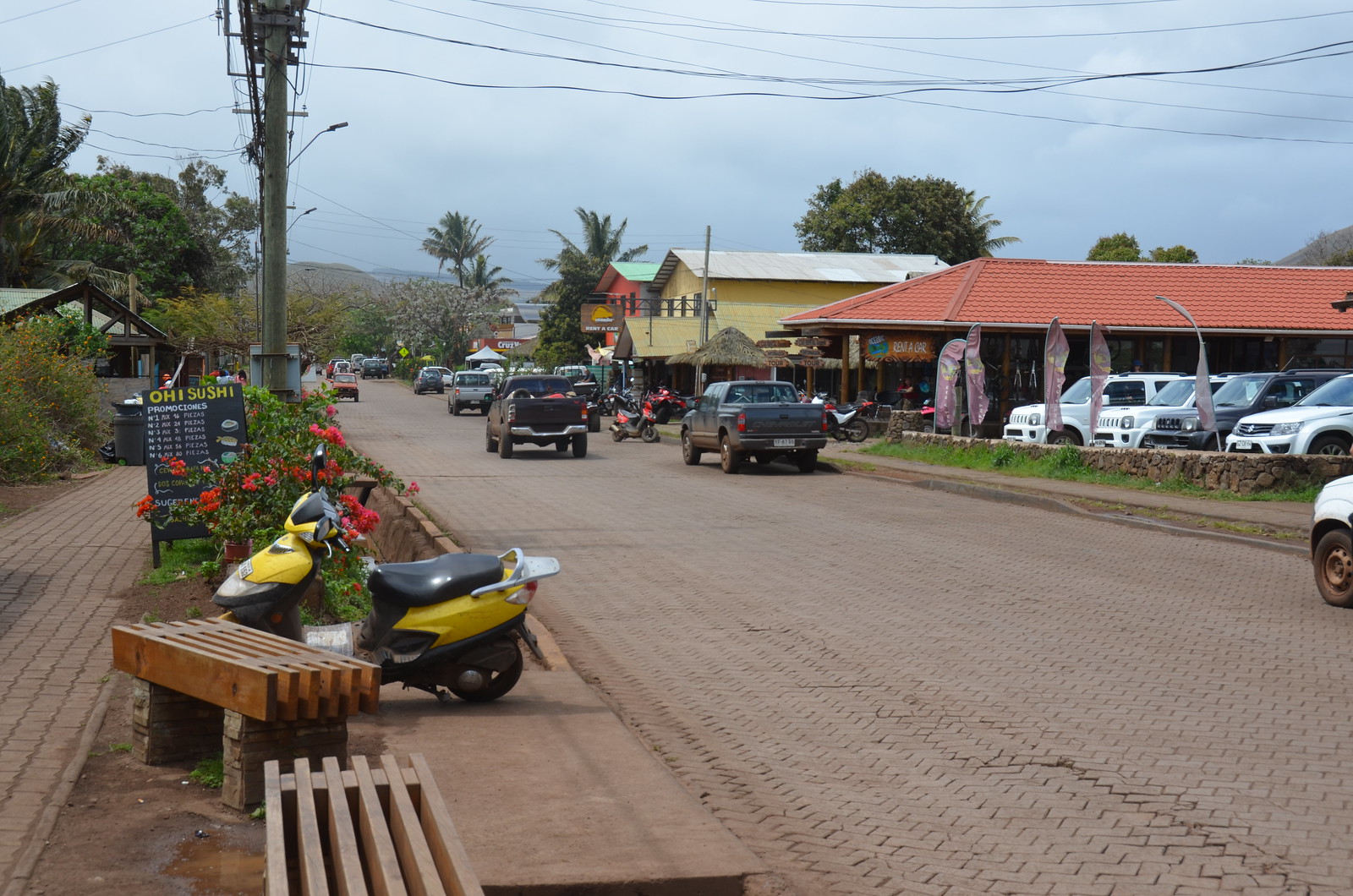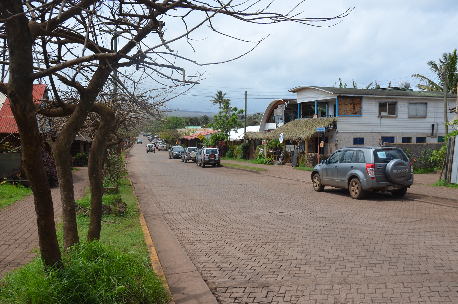 We walked from the hotel down Ave Atamu Tekena towards the harbour Caleta Hanga Roa. The weather was a bit stormy but it came in waves and would clear up in about 10 minutes after the showers passed. The roads in town are all cobblestoned, which made for an interesting sound as the cars and trucks passed over them.
