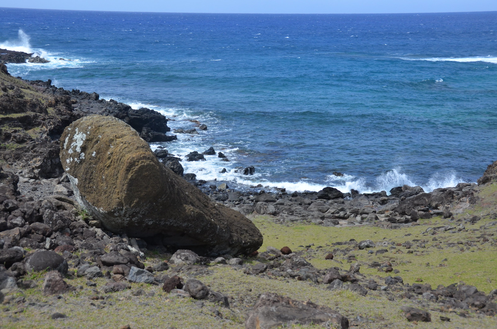 There were several moai that had been pushed down adjacent to the ocean. The surf crashing in behind them made for an impressive sight. There were several top knots (the hats) lying nearby