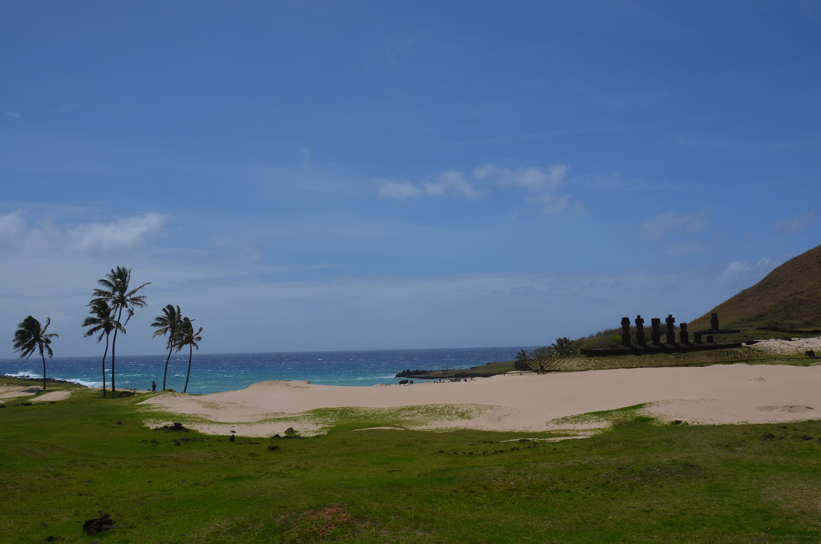 We then made our final stop of the day at the picture postcard beach of Anakena. This has to be one of the most beautiful island beaches I’ve been to. It has all the features you’d find in a travel brochure magazine with implanted coconut trees (from French Polynesia) that make the place look like an island paradise. You had to pass through the coconut grove to get to the beach.