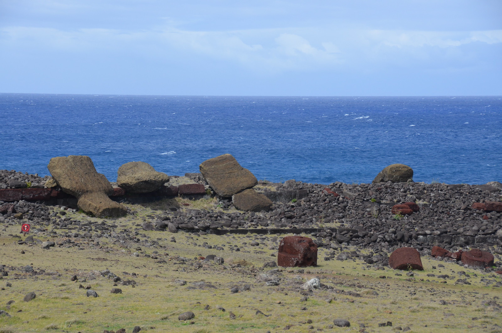 We wandered through the back to see the reconstructed ahu platform. You can see the reverse view from here towards the quarry, along with the awesome view towards the water.