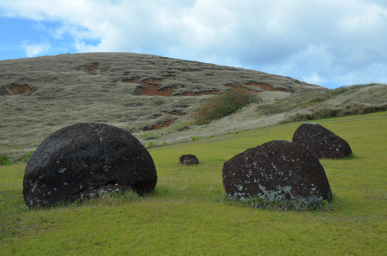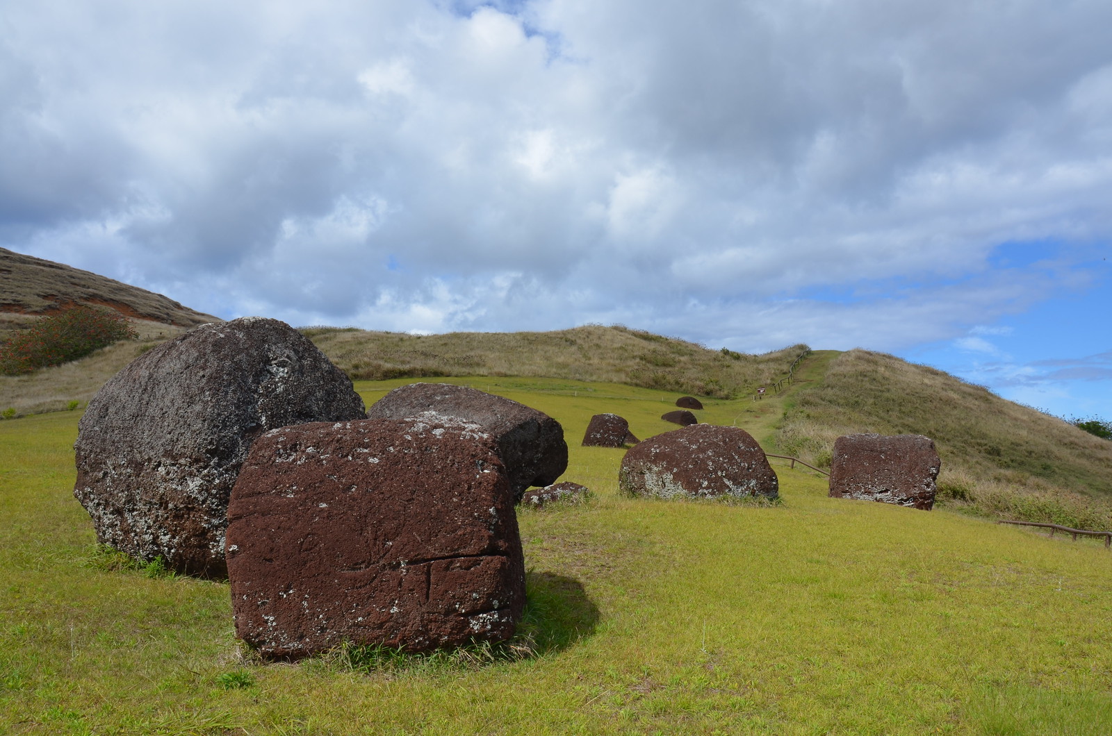 The islanders made the top knots here and rolled them to the sites for final installation. Reportedly, the top knots were made for individual moai and not all top knots could be installed on all moai since they had interlocking features. The quarry was 12 km to the shore line and 12 km the other quarry at where the moai were chilsened. The place looked like a Microsoft Windows screen saver in the sunshine, with rolling clouds and gentle sloping hills.