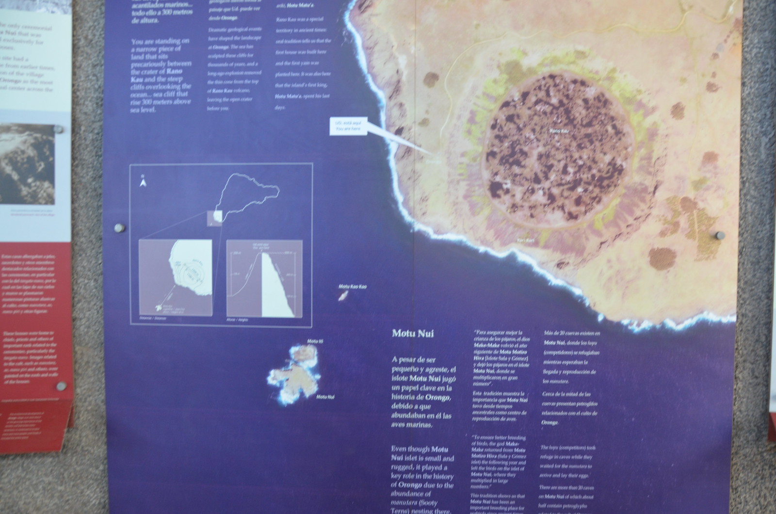 We were led to the re-constructed village which happens to sit on top of the volcano rim. After the Rapa Nui persons knocked down all the moai word has it that they settled up here in tiny boat covered houses. The birdman games led competitors to run down to Moto Nui to chase after the first egg of Mantura bird. The winner who was able to return the first unbroken egg to to the top got to rule the island for a year. Moto Nui is the small island down at the bottom. There was supposed to be great clear snorkling down there but apparently not much fish.