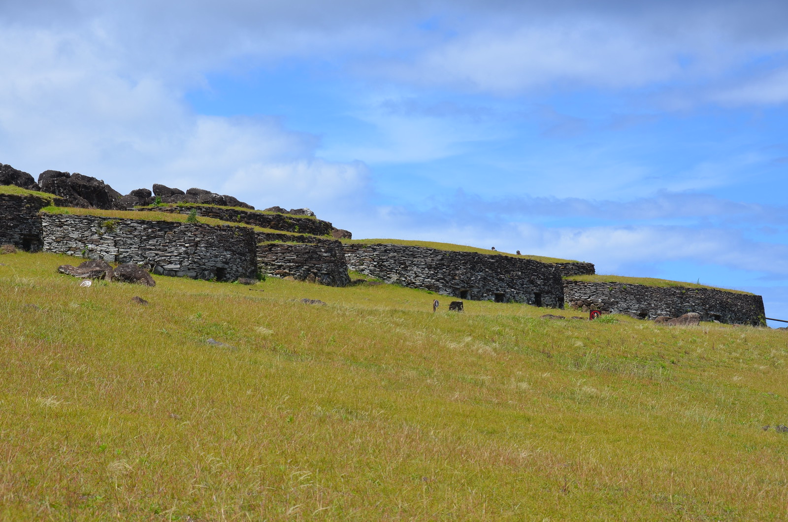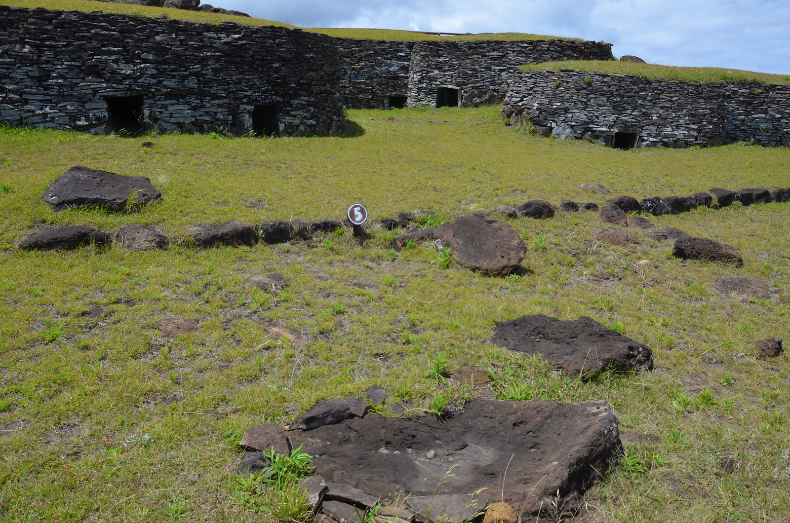Uphill from the ahu and 4 moai with top knots, we saw ruins of a boat house foundation in the grounds above the site. This was allegedly the settlement and house where explorers first set foot on Rapa Nui.