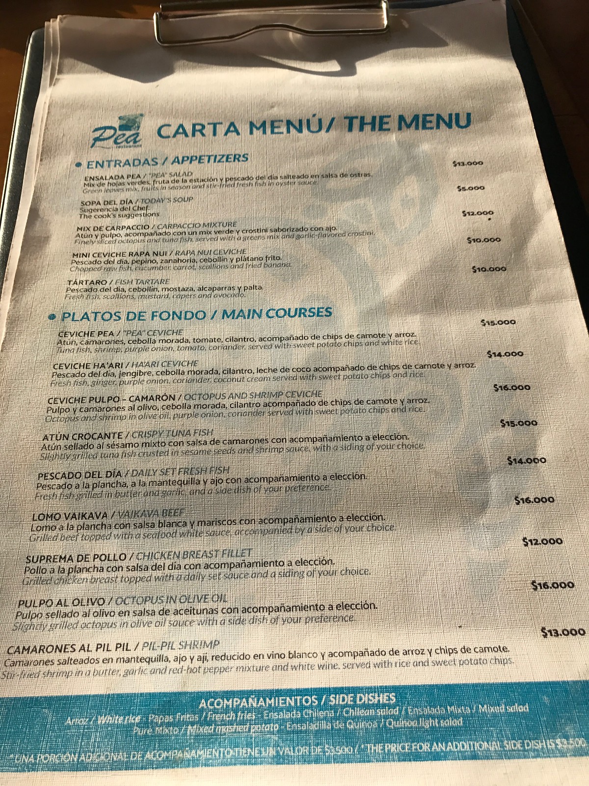 We had our last dinner of our 5 day, 4 night trip down at Pea in Hanga Roa where we started with the snacks on day one. The menu was mostly the easily obtainable fish; tuna, ceviches and other seafood items. Pea offered another open air dining experience with awe inspiring ocean views.