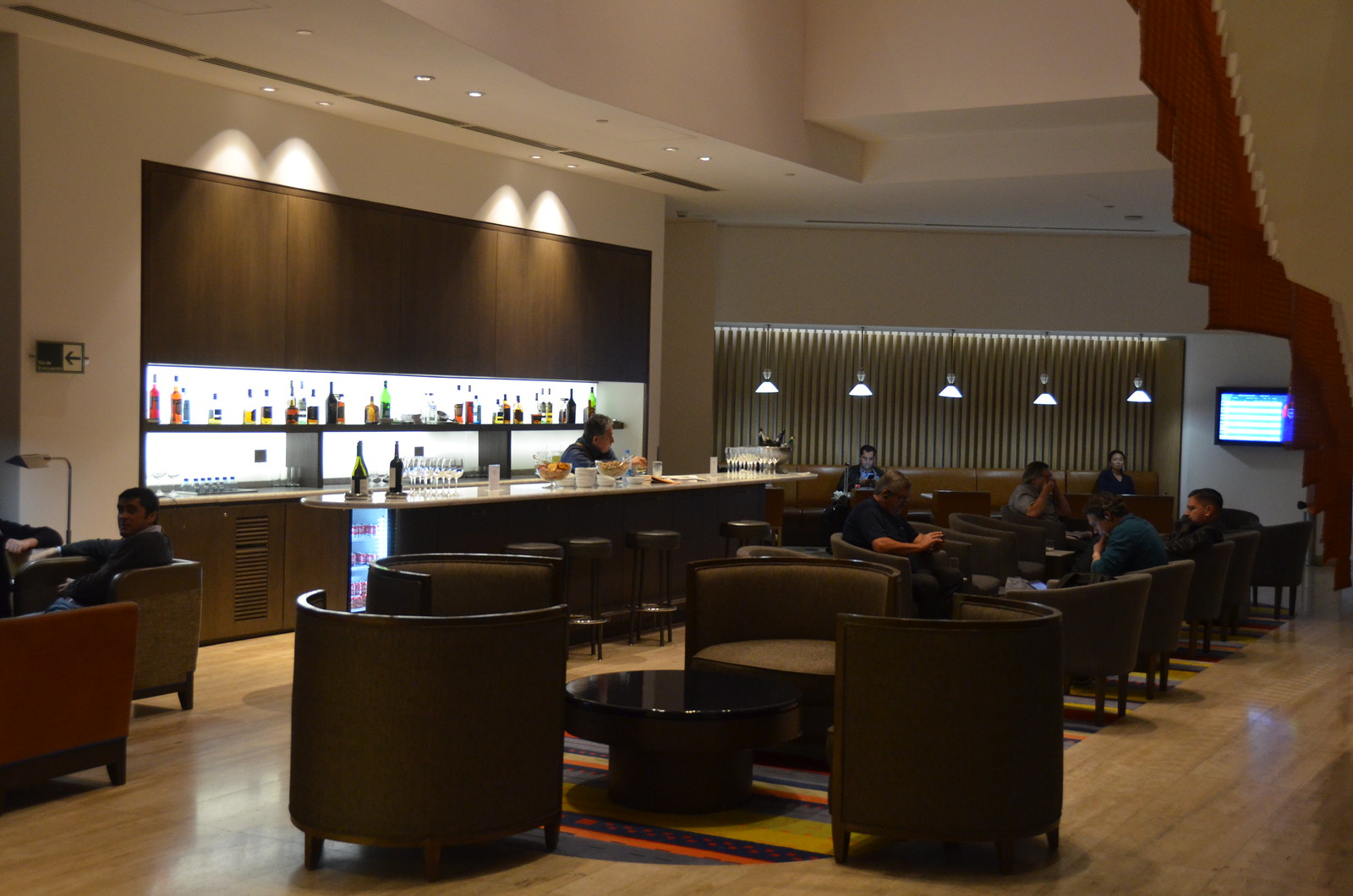 The feature of the downstairs area was the large grand staircase. It made a strong statement. However, a staircase of this length is really impractical in an airport lounge since most travellers are carrying rolling suitcases or laptop bags and are more likely to use an elevator. During our time here, I typically saw staff as the only people actually using the staircase.