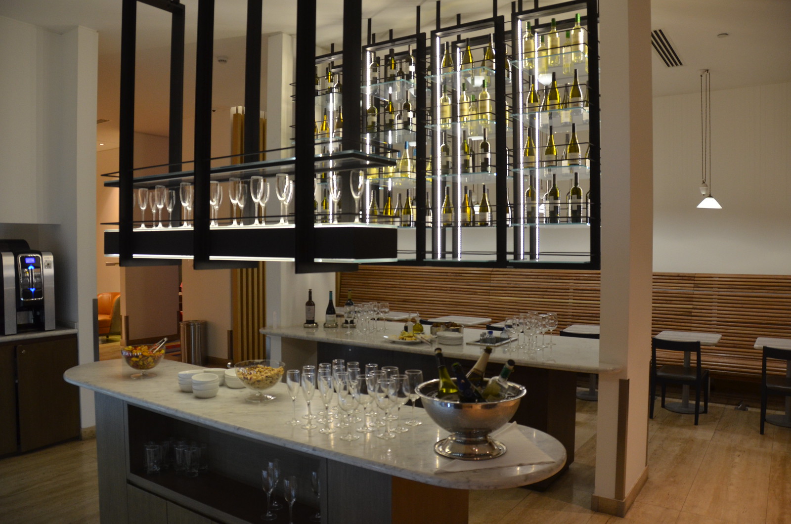 The back area was much quieter than the front area. Although it was quieter, it didn’t feature the impressive airside views. It did feature a large wine display and bar area, which made for an inviting and tranquil space.