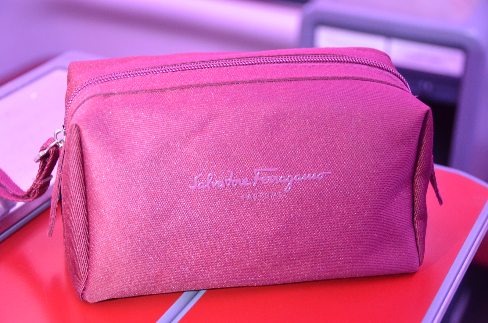 The dinner menus were presented while I we were waiting on the ground. After the menu service, the Salvatore Ferragamo amenity kits were dropped off. This time red kits were offered as a primary option, although I saw some travellers getting some blue ones. I ended up with a red kit. I had amenity kit remorse after I had opened it, wishing I had gotten another blue one. The red ones had a more female look to them, whereas the blue ones had a more masculine look to them.