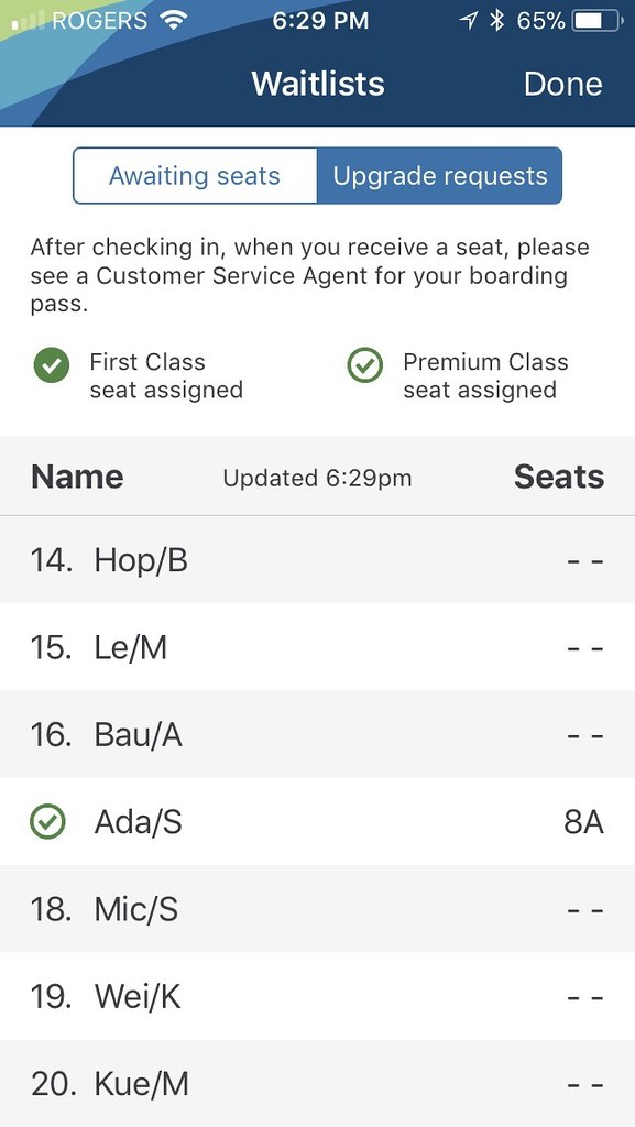 There was no premium or first class upgrades available today. I ended up way down as an MVP at number 15 on the upgrade list. I later learned that selecting an emergency exit row exempts you from any MVP upgrades at all.