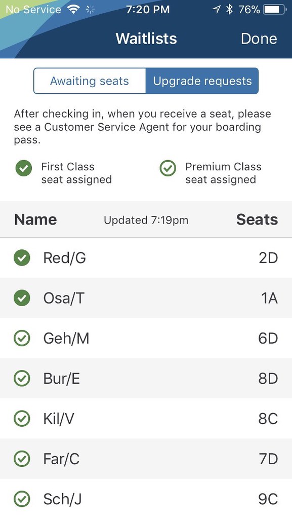 After lunch and over at the gate, MrsWT73 was called up to the podium for an “important message”, which was a cleared upgrade on the Alaska Mileage Plan MVP Unlimited Domestic Upgrade list. As an Alaska Mileage Plan MVP Gold, she was #2 on the list at the flight closing time. As an MVP, I ended up as #15 on the list again and would have to settle for the comforts of 17F as the exit row.