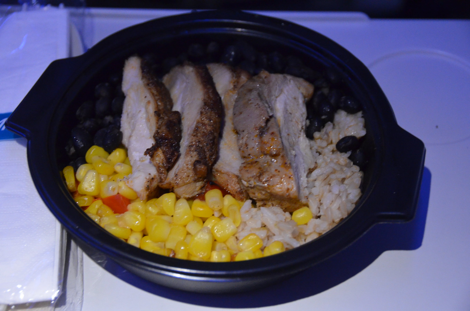 Once airborne, it was a mostly smooth flight. Despite having the sandwich, I opted for buy on board again and had the Sonoran Chicken Skillet with chili roasted chicken, served with brown rice, roasted corn, red peppers and savoury black beans. It was almost all that but otherwise different than the usual buy on board offerings.