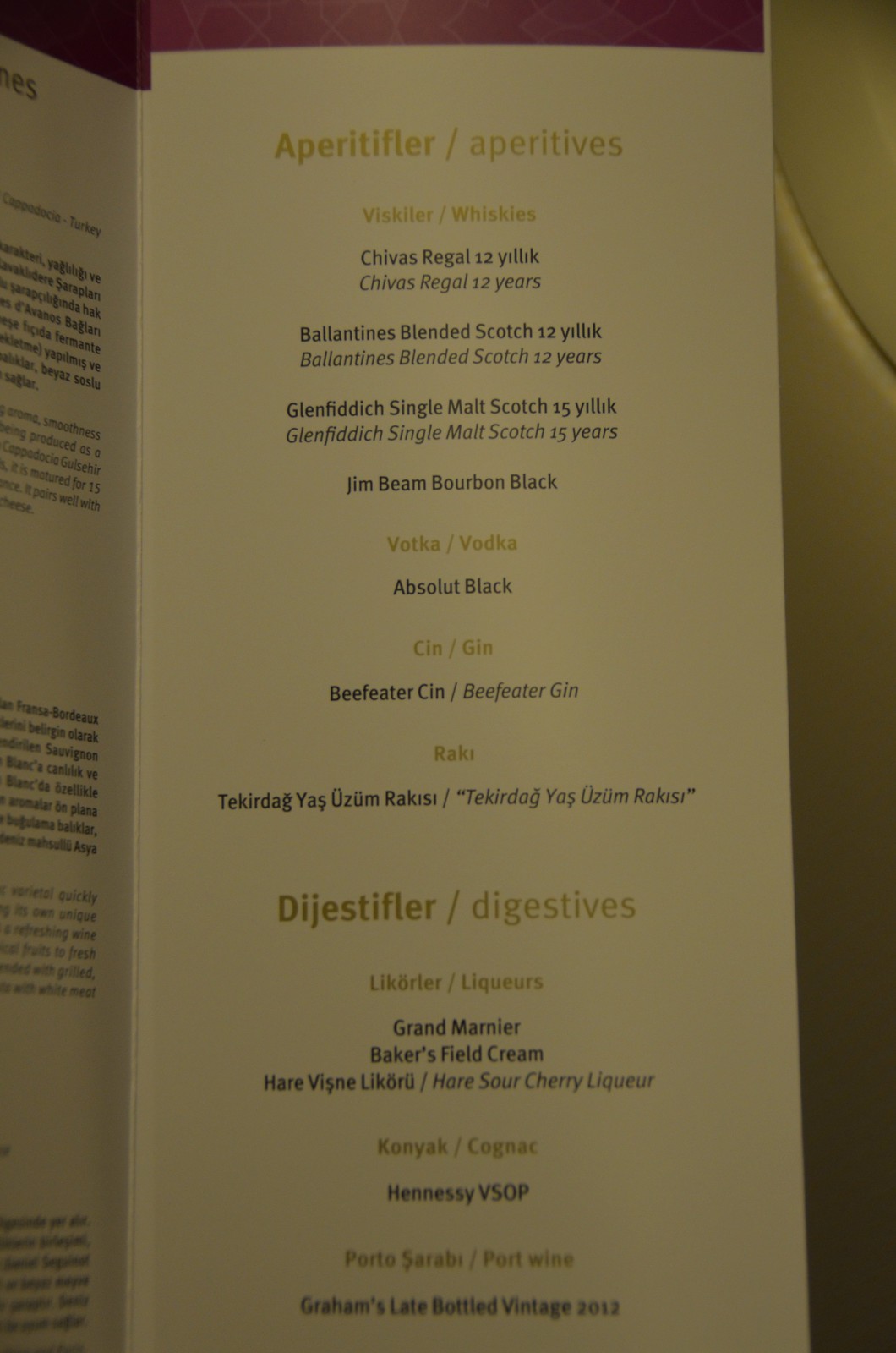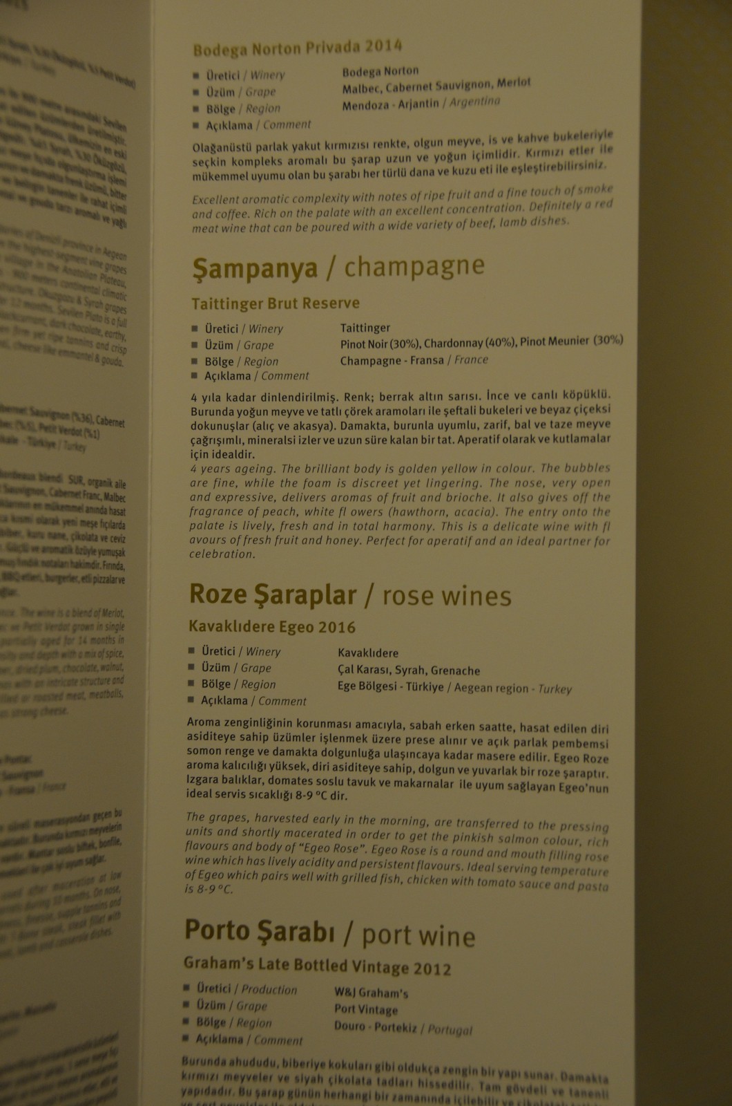 The drink wine list was even more impressive. It contained 11 wines, although 4 of them were from Turkey. There were 3 whites, 5 reds, a champagne, a rose and a desert wine. The menu has somewhat of an institutional look to it, unlike other carriers that dress up their wine menus which pictures of the wine bottles or wine labels.