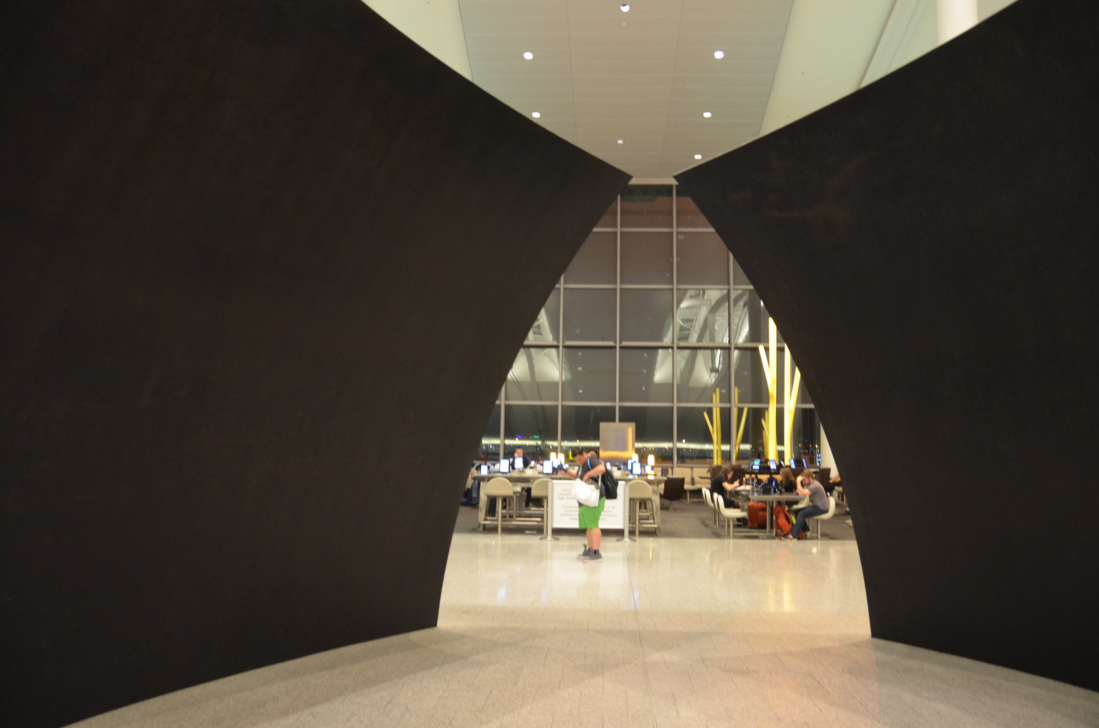 At about fifty five minutes before our flight, we left the Air Canada Maple Leaf Lounge Toronto International and headed down to the international gate departures area. We passed by the beautiful “Tilted Spheres “sculpture in the international departures hall. The sculpture is so large, the sculpture had to be installed prior to the walls and roof going onto the building. Every time I pass by, I always go stand in the middle of it and listen to the echo of my voice. If you’re through the Toronto Pearson International Airport Terminal One, you should try it… it’s pretty neat.