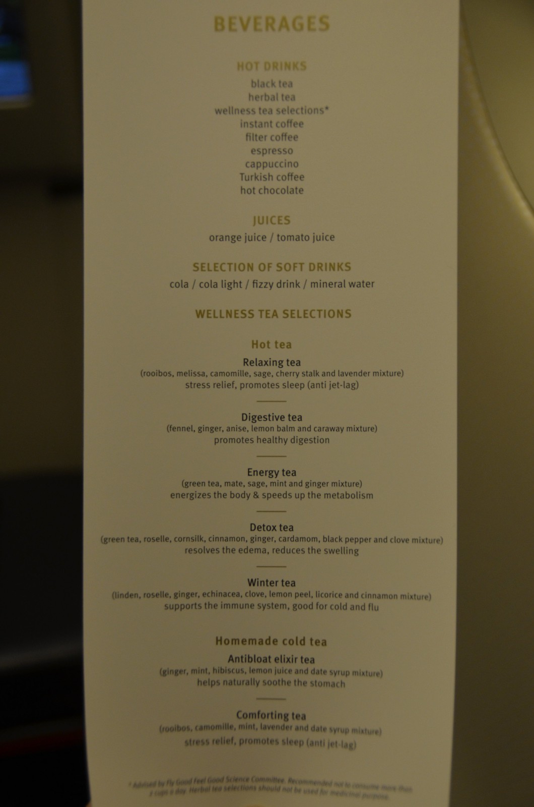 As we settled in, we got the usual Turkish offering a choice of non alcoholic pre departure beverage of water, orange juice or the terrific lemon and mint. We both had lemon and mint, which is always a great start. At least if it is a non-alcoholic offering, Turkish does it right with a selection of interesting drinks.