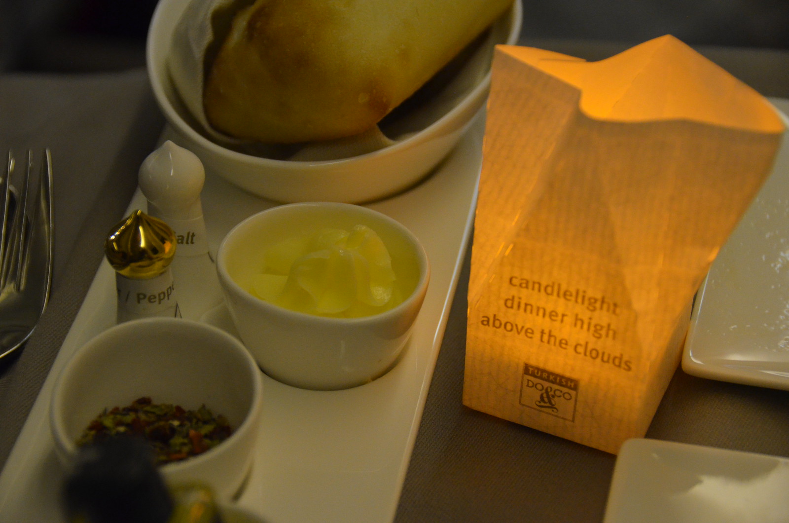 The dinner service started with a small mezze platter, and soup, plated together. This came with the oh so cool LED candle light in the sky which is a silly, but excellent touch of ambience at cruising altitude that I always look forward to on Turkish Airlines.
