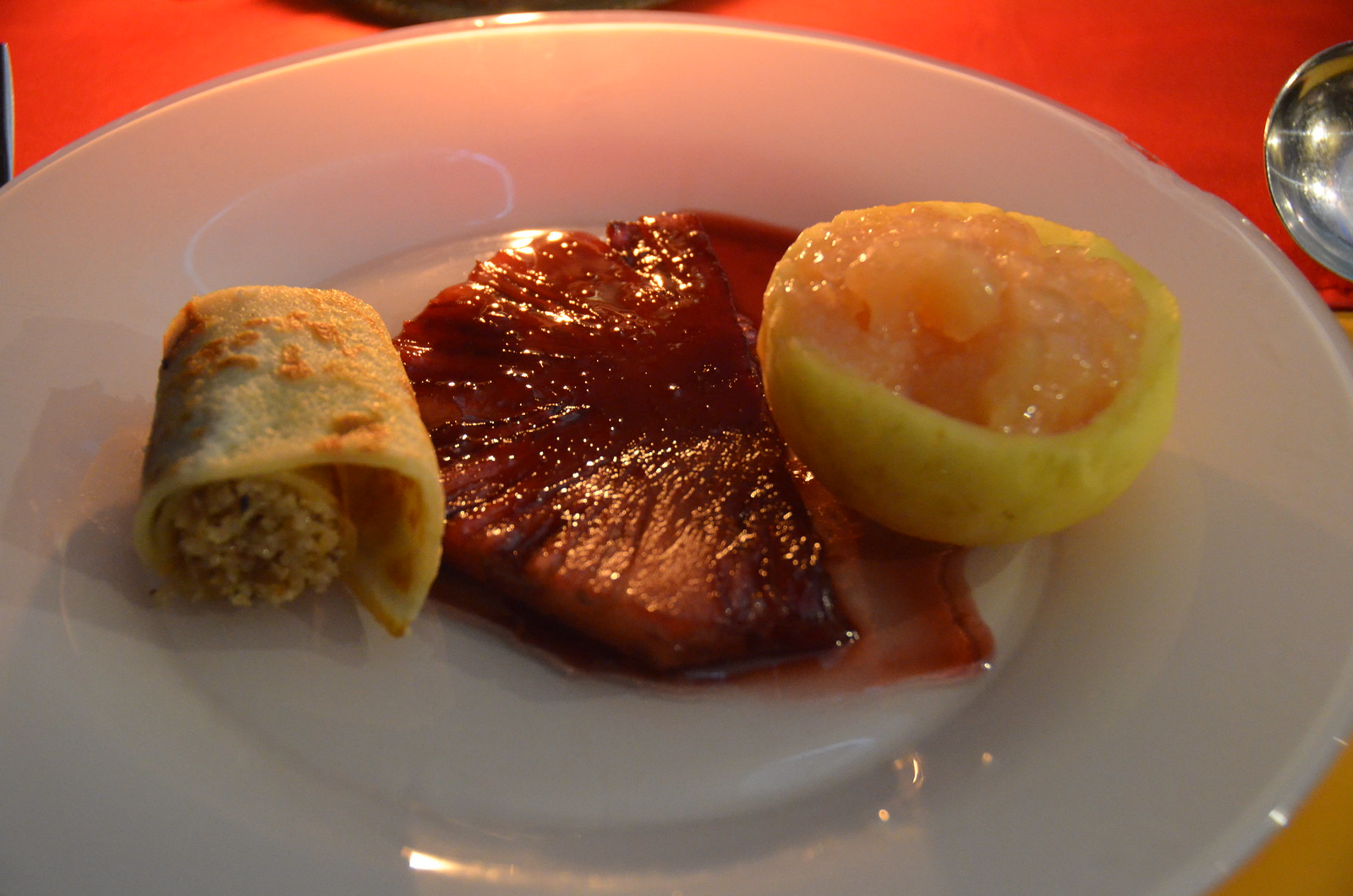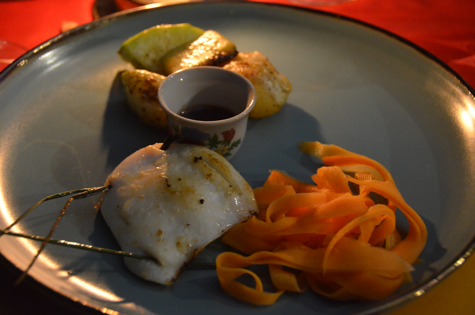 The third course was Lemongrass Calamari, Cinnamom Mung’unye, Pickle Carrot. The lemongrass was the thin grass variety, not the giant stalks that we were accustomed to see at home. The calamari was also cut into a thin shaving, unlike the usual rings that we had at home. It was served with a sauce, which had a mild spice to it; exceptionally tasty.