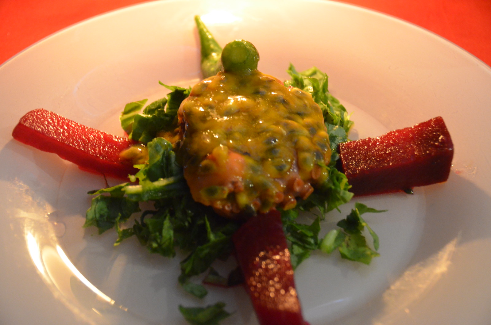 The second course was a Pweza (Octopus) Passion Salad, Chili, Lemon Beetroot, Garlic Bamia. MrsWT73 has an aversion to octopus and shrimp. The restaurant was kind enough to accommodate with a tuna peppercorn substitution for her dish. The octopus was very fresh – not tough meat like some of those local second rate sushi restaurants get away with serving. The passionfruit blend with the octopus was very unique and paired surprisingly well with beetroots that tasted like they were straight off the farm.