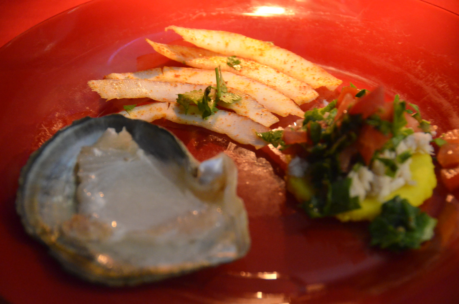 The first course was a Dona Cake Fish Patee, Coconut Relish, Limao la Shamba Ceviche. The ceviche was served in a clam shell. The sauce was nicely acidic, like many ceviches I’ve had.
