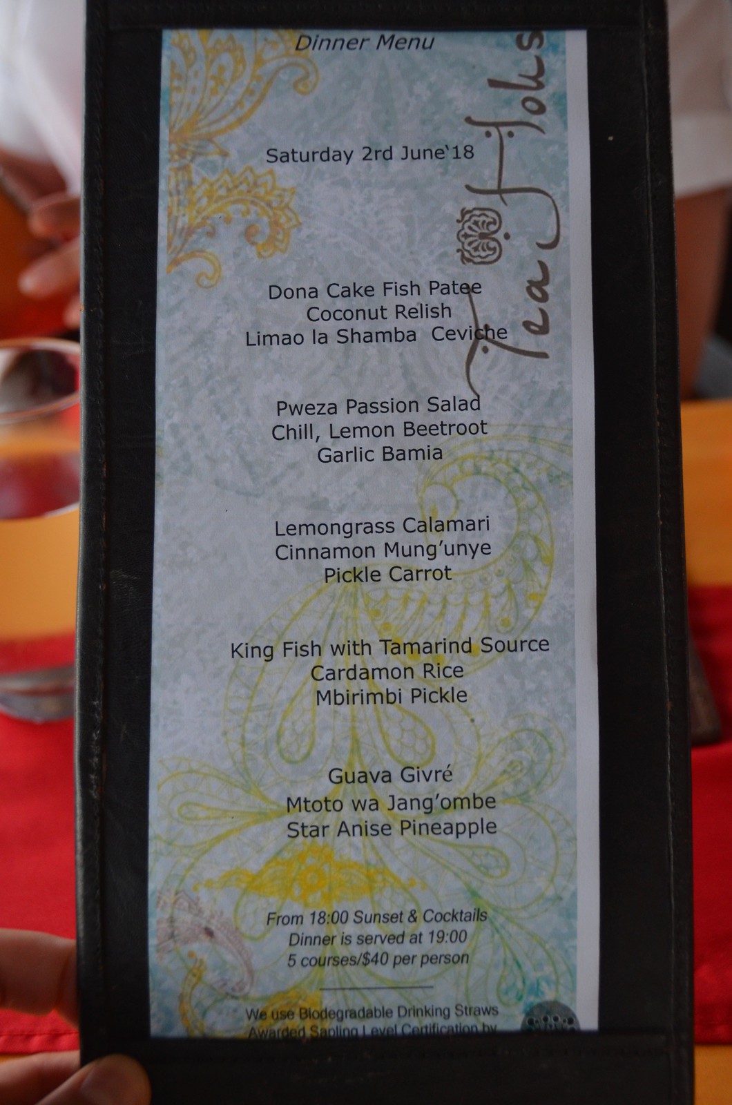 The last serving was a dessert item called Guava Givré, Mtoto wa Jang’ombe, Star Anise Pineapple. It was a delicate guava sorbet with a star anise sweet sauced over fresh pineapple. It was really unique and a refreshing end to a meal in a region that usually just serves plain fruit to finish a meal.