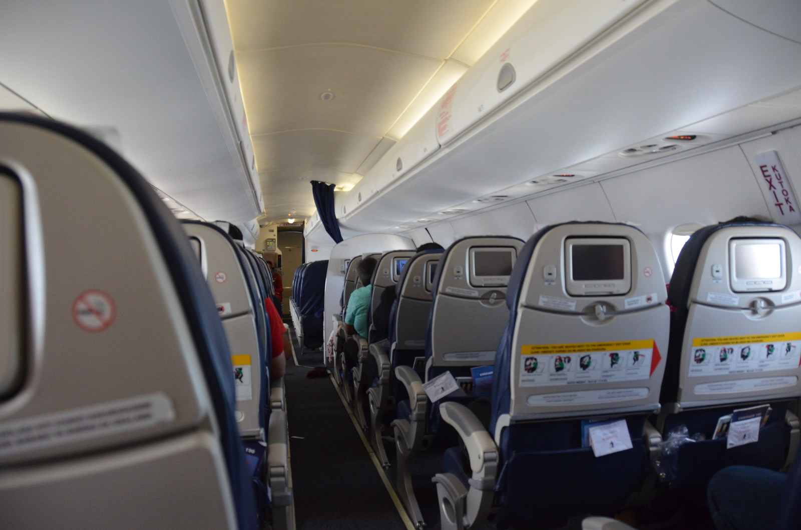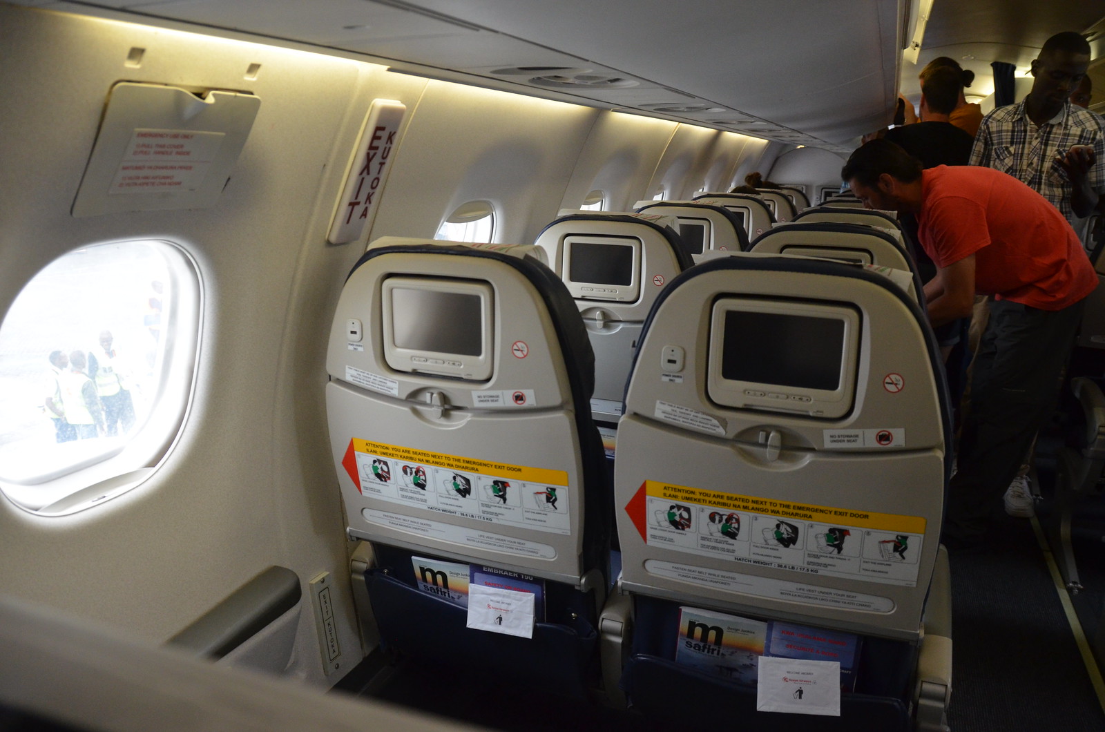 We boarded through a ramp stairway to door L1. The Kenya Airways Embraer 190 is set up in a 1 – 2 configuration in business class, and a 2 – 2 configuration in economy class. We found our way to seats 19A and 19C. I gave MrsWT73 the window for this leg since she was feeling a little delicate. I couldn’t get us seated any closer to the front for this flight, despite trying at on line check in and during the reservation process.