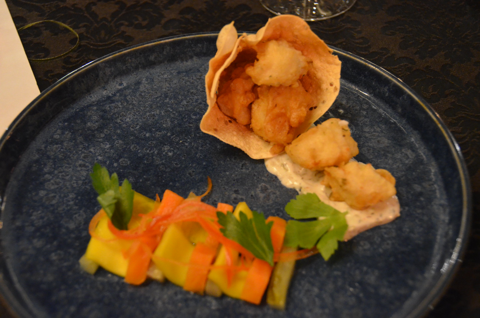 The first course presented was Grouper, labelled as Grouper Beignet, vegetables confit, and tartar sauce. While the grouper that I have had in the past was quite bland, this was prepared exceptionally well. It was spiced just right and lightly battered in a manner that was not overpowering.